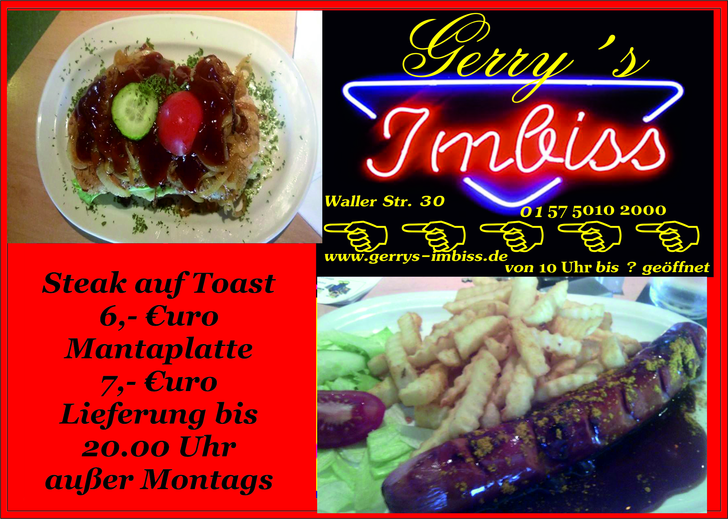 Willkommen auf der Website von Gerry´s Imbiss!Gerry´s Imbiss ist der Ort in Bremen, an dem Sie mal anders als wie bei einem gewöhnlichem Imbiss essen können. Sehen Sich ruhig unsere Speisekarte an und unsere Bildergalerie weiter unten. |